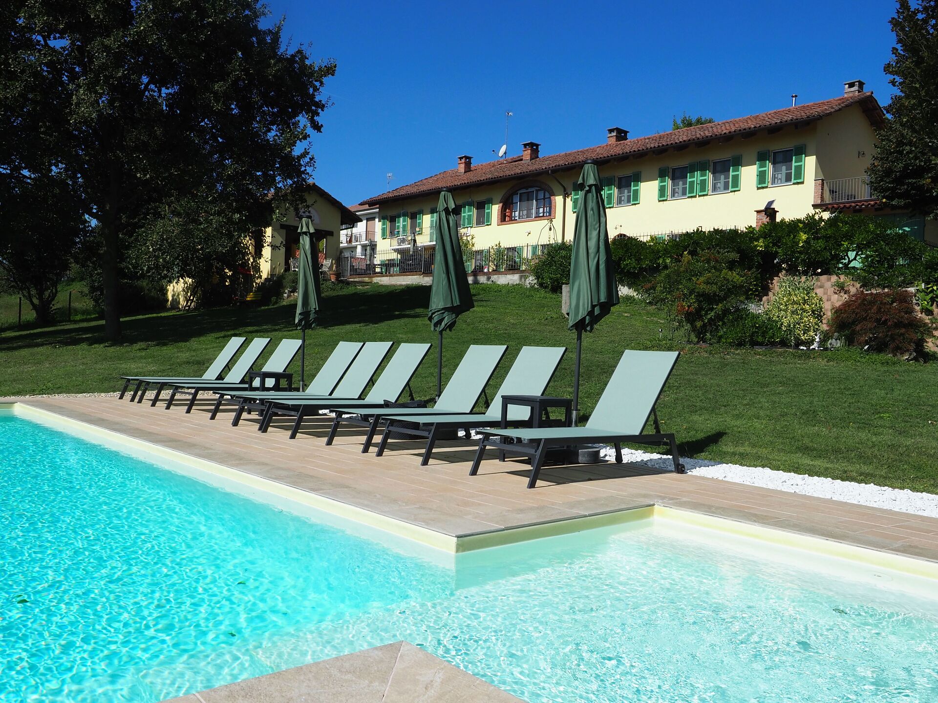 The Villa "Piemonte" in Tigliole, is situated on hilltop with a splendid view over the hilltop of the typical landscape of Piemonte with its wineyards, ancient villages and some old castles dated back to the middle Ages. The guesthouse was opened in May 2016, transformed out an farmers farmhouse. It shows in romatic style and is designed with lot of Love to the details. The Vila have Air condition, a heating and Fly Screens . The Area is designed for Relaxion includes a garden with 4500 m2. A privat Infinty Pool with Salwater and a Whilrpool. And a sun-terrace with the beloning equipment. In the courtyard you will find a BBQ Area with the summer kitchen with place to eat and also in the courtyard you have place to eat outside. We talk English, German, Italian and understand Switzerdutch